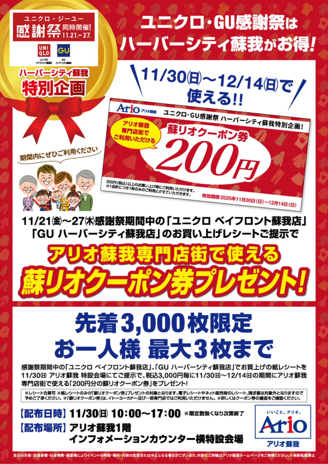 11/21(金)~27(木)感謝祭期間中の「ユニクロ ベイフロント蘇我店」「GU ハーバーシティ蘇我店」でお買い上げの紙レシートを11/30(日)アリオ蘇我 特設会場にてご提示で、税込3,000円毎に11/30(日)~12/14(日)の期間にアリオ蘇我専門店街で使える「200円分の蘇リオクーポン券」をプレゼント!