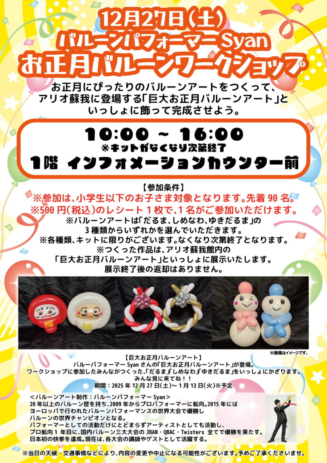 ※つくった作品は、アリオ蘇我館内の「巨大お正月バルーンアート」といっしょに展示いたします。展示終了後の返却はありません。