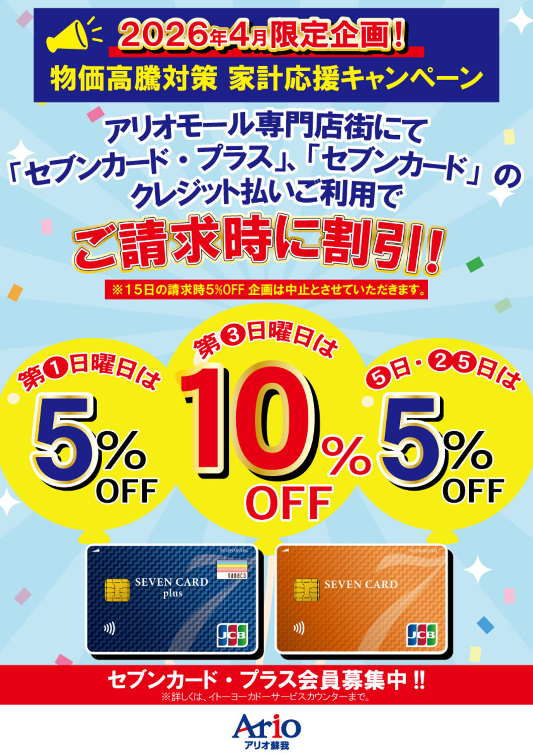 アリオモール専門店街にて「セブンカード・プラス」、「セブンカード」のクレジット払いご利用でご請求時に割引!