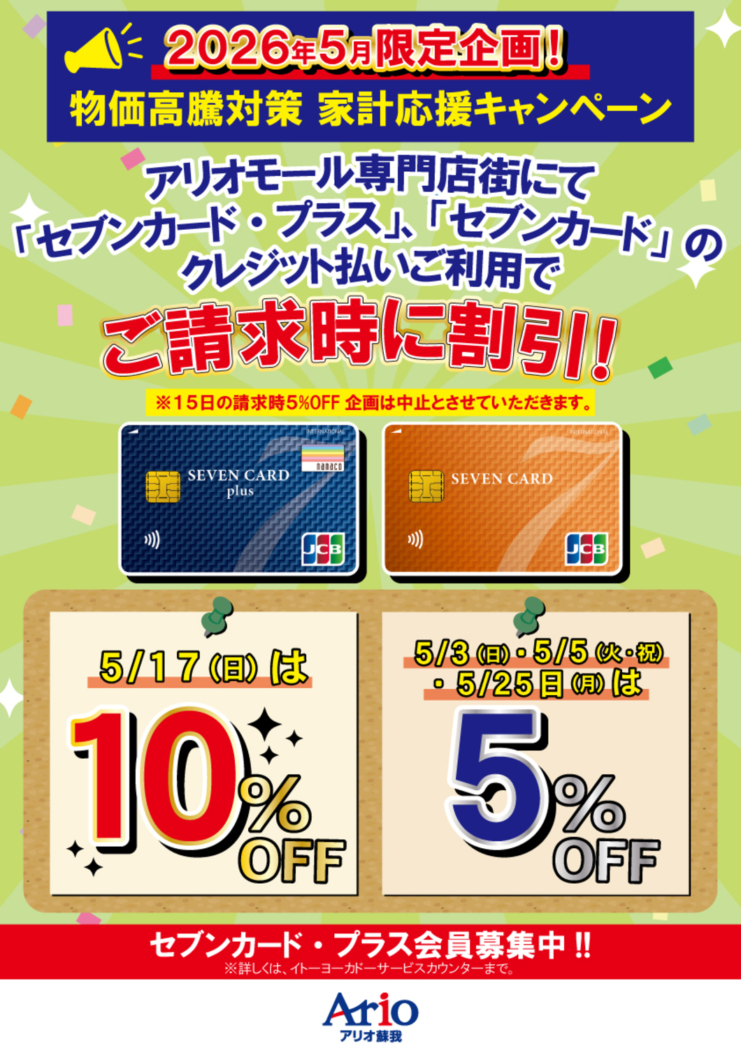 アリオモール専門店街にて「セブンカード・プラス」、「セブンカード」のクレジット払いご利用でご請求時に割引!