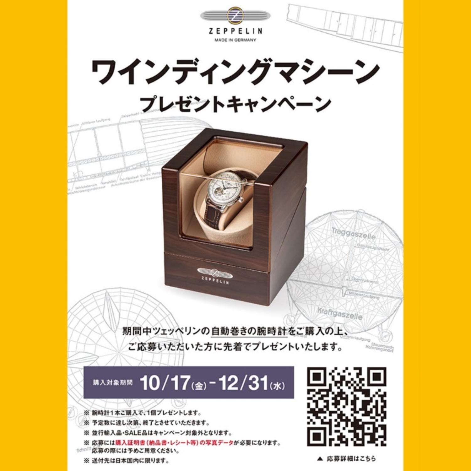 当店にて、期間中ツェッペリンの対象の腕時計をご購入のうえ、WEBにてご応募いただいたお客様に先着でワインディングマシーンをプレゼントするキャンペーンがスタートいたします。