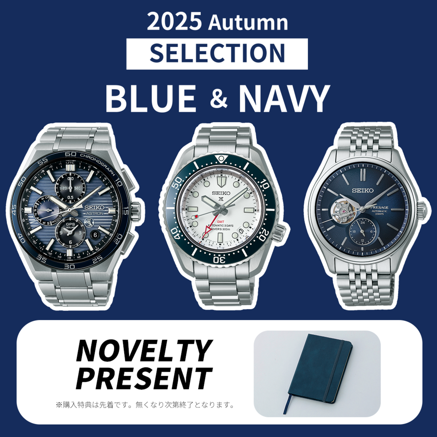 期間中、対象商品をお買い上げのお客様に、購入特典として先着でオリジナルレザー調ノート(ネイビー)をプレゼントいたします。