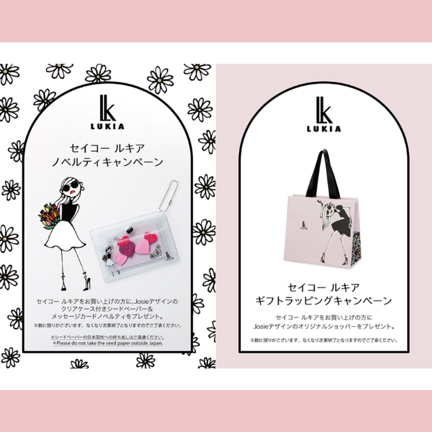 当店にてセイコールキアをお買い上げの方に、【Josieちゃんデザインショッパー】、【Josieちゃんデザインシードペーパー&メッセージ】をプレゼントいたします。