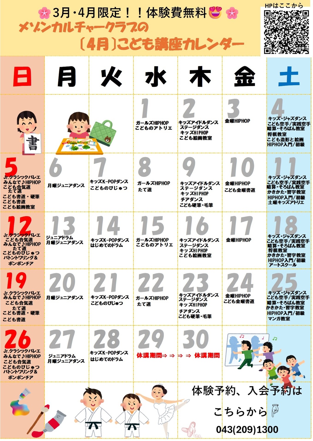小学生以下の方は体験費(通常受講料1回分)が1講座無料になります!